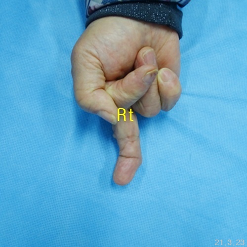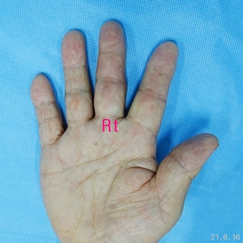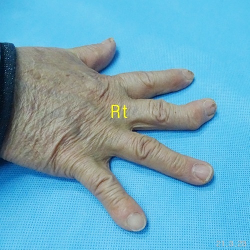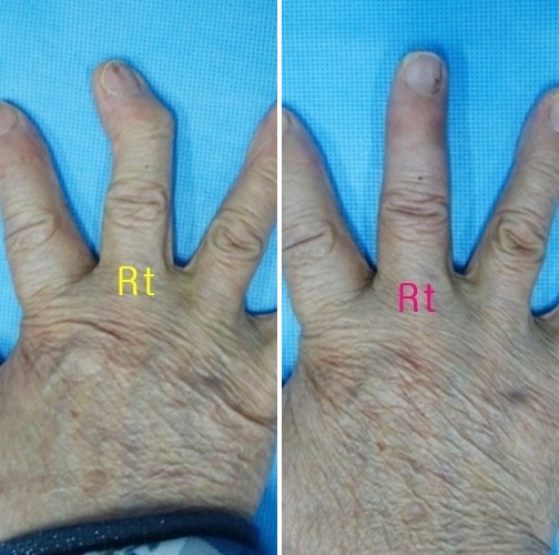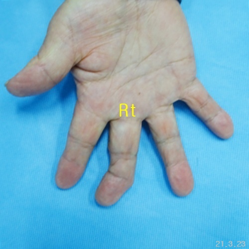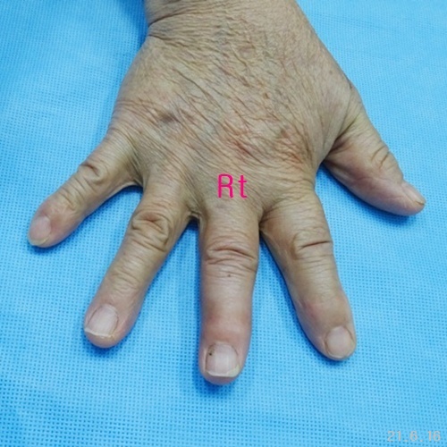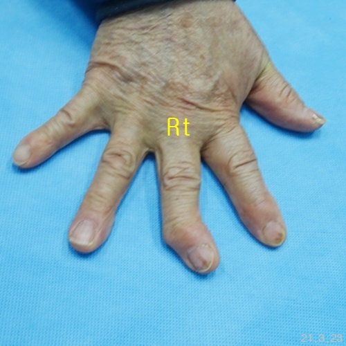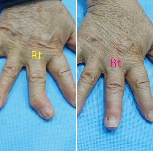 평생 손가락휨 때문에 손 모양이 콤플렉스였던 환자는 가정일을 포함한 일상생활에서 불편함이 많았고, 나이가 들면서 관절염이 생기고 손가락이 더욱 휘어지는 손가락휨, 굴지증 변형때문에 한번에 치료할 수 있는 외과적 처치 방법을 선택하여 부분마취로 진행된 굴지증 수술은 단 20분 만에 끝났고, 다음 날부터 가벼운 일상생활에 복귀할 수 있었습니다. 무엇보다 손 모양이 자연스러워져 “이제는 자신 있게 악수를 할 수 있다"라며 만족감을 표현했습니다.