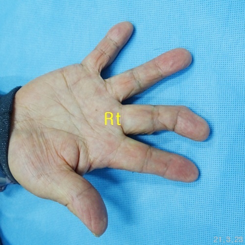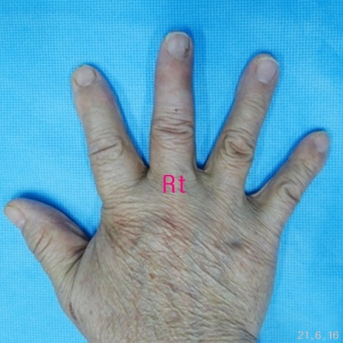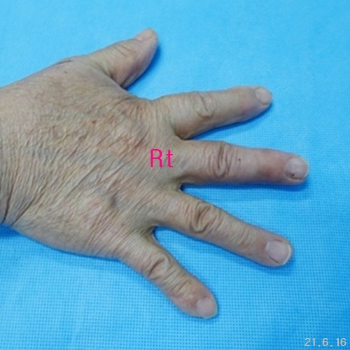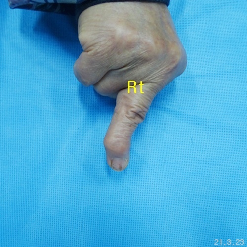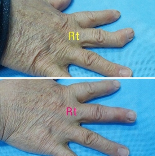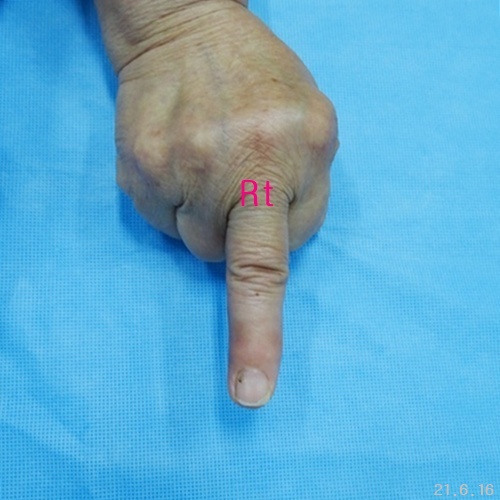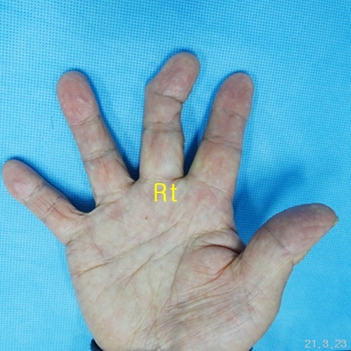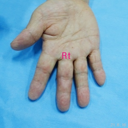 평생 손가락휨 때문에 손 모양이 콤플렉스였던 환자는 가정일을 포함한 일상생활에서 불편함이 많았고, 나이가 들면서 관절염이 생기고 손가락이 더욱 휘어지는 손가락휨, 굴지증 변형때문에 한번에 치료할 수 있는 외과적 처치 방법을 선택하여 부분마취로 진행된 굴지증 수술은 단 20분 만에 끝났고, 다음 날부터 가벼운 일상생활에 복귀할 수 있었습니다. 무엇보다 손 모양이 자연스러워져 “이제는 자신 있게 악수를 할 수 있다"라며 만족감을 표현했습니다.